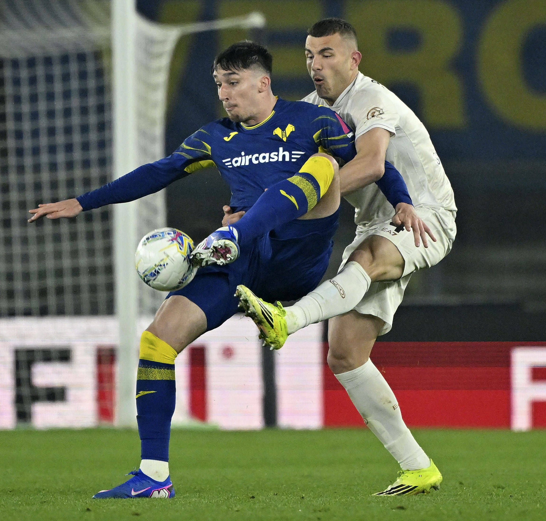2月28日,那不勒斯队球员霍伊伦(右)与维罗纳队球员贝拉-科沙在比赛中拼抢。 新华社发(阿尔贝托·林格利亚摄)